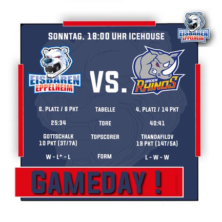 Am Sonntag steht das Rückspiel gegen die Baden Rhinos an. Im Hinspiel musste man sich am Beginn der Pokalrunde unglücklich mit 3:5 geschlagen geben. Die Eisbären konnten seitdem einen Aufwärtstrend einleiten und könnten mit einem Sieg ans Tabellenmittelfeld ranrücken. Für die Eisbären sollte auch die Auswärtsschwäche der Rhinos sprechen, die in der Pokalrunde bislang nur in Mannheim gewinnen konnten. Doch auch die Eisbären konnten im heimischen Icehouse erst zwei Punkte verbuchen - doch sind heiß nach dem Sieg gegen Stuttgart nun auch zu Hause nachzulegen.